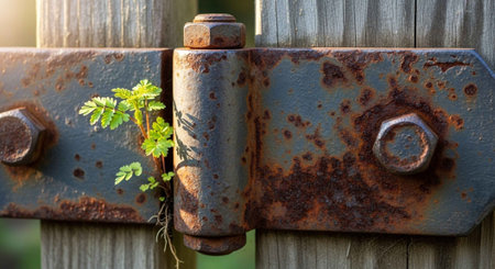 Rusted metal geate with lock and grass
