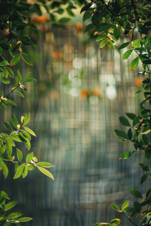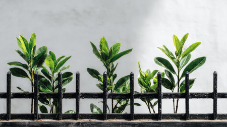 Lush green leaves emerge from a black iron fence against a clean white background, creating a serene atmosphere enriched by natural light and organic beauty.