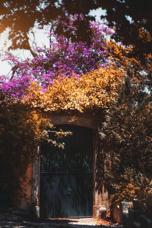 A vertical view from the street of a metal gate in a stone orange wall overgrown with an autumn and summer greenery with a dazzling blossoming lilac tree above; an old iron door in a garden outside