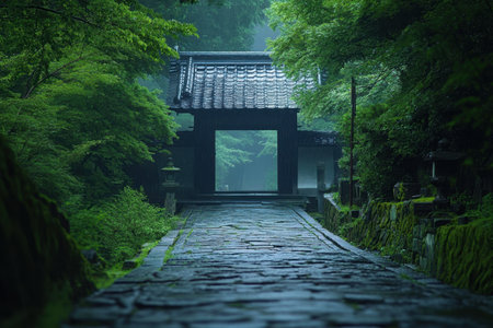 A peaceful stone pathway guides visitors toward a traditional temple gate, enveloped in vibrant green foliage.