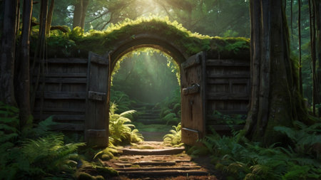 Fantasy gate in the forest with ferns and sunlight.