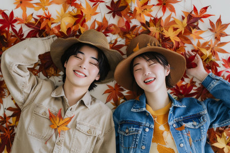 Embraced in a loving hug, this Japanese couple smiles radiantly against a soft-focus autumn backdrop, embodying warmth and affection during the fall season