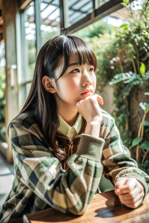 a teenage a japanese girl sitting with their chin resting on their hand, eyes looking off into the distance
