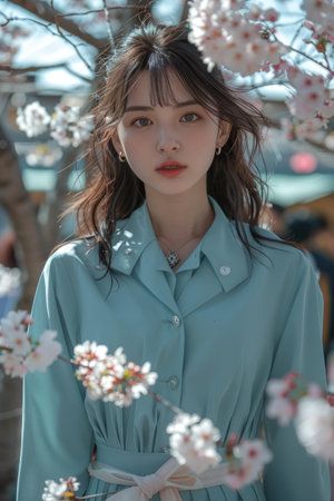 Unidentified girl in a blue coat with cherry blossom