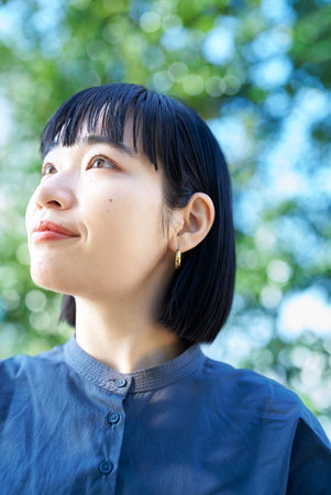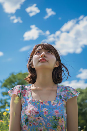 Generative AI Image of Beautiful Japanese Girl in Flower Park Looking at the Blue Sky