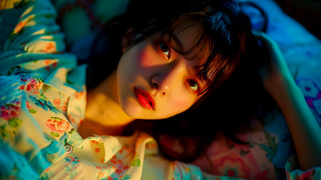 A woman with long dark hair and red lipstick is laying on a bed. The bedspread is floral and the room is dimly lit