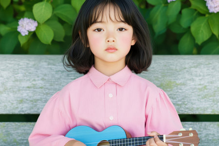 Young Girl in Pink Dress Playing Blue Ukulele on a Bench with Green Foliage.