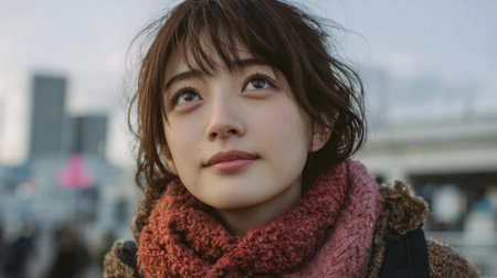 A woman stands outdoors, wrapped in a cozy scarf, looking up with a contemplative expression. The chilly urban landscape features buildings and drifting clouds under a pastel sky.