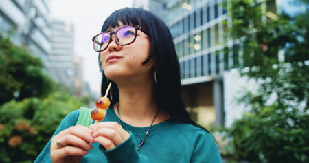 Travel, eating and woman with snack in city on vacation, adventure or weekend trip for journey. Thinking, fun and hungry Japanese female person enjoying dango for dessert in urban town on holiday.