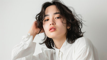 a Japanese teenager in trendy white clothes, posing confidently on a white studio background