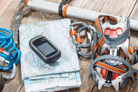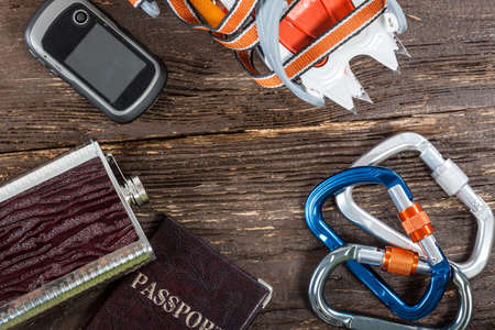 Top view of equipment for mountaineering and hiking on white wood table with empty space in the middle. Items include passport, carbines, flask, crampons and gps.