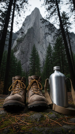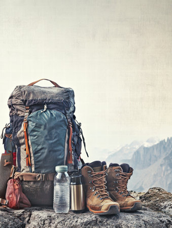 Backpacking gear including a sturdy hiking backpack, water bottle, and rugged boots set against a scenic mountain backdrop