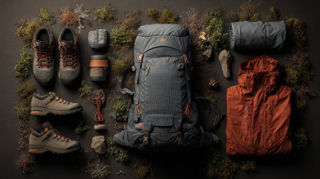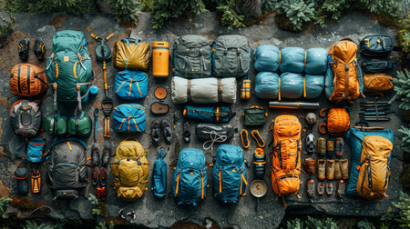 Aerial view of neatly arranged travel gear and equipment for a mountain trip, showcasing backpacks, hiking boots, and camping essentials. Ideal for adventure, exploration, and outdoor activities.
