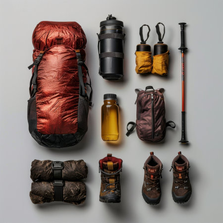 A flat lay of essential hiking gear including a striking backpack, a durable water bottle, trekking poles, boots, and warm clothing, ideal for every outdoor enthusiast.