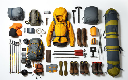 Travel Gear for Camping: Camping equipment laid out on a white background,Generated with AI