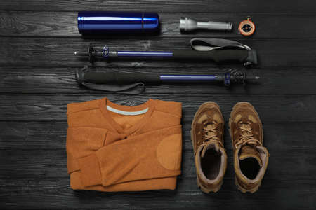Flat lay composition with trekking poles and other hiking equipment on black wooden background