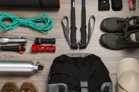 Preparing for a hiking trip: backpacking things and clothes flat lay. Top view of trekking boots, tourist rucksack and camping acessories on the floor