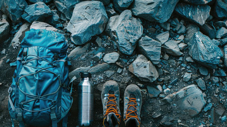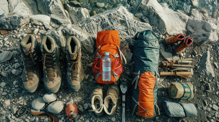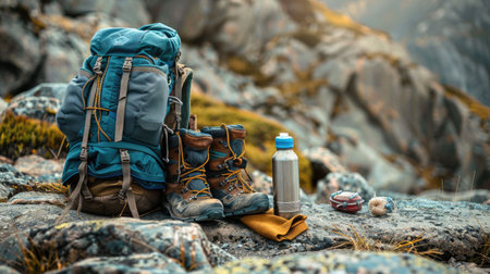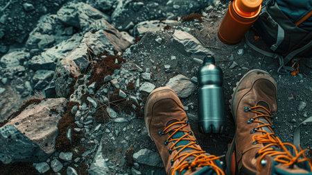 Hiking boots and gear ready for an outdoor adventure, set against a rocky terrain. AIG50