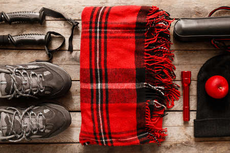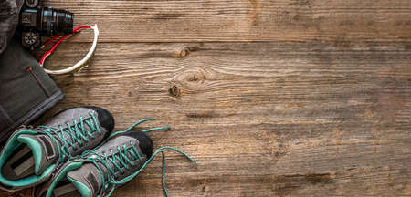 Hiking or travel equipment with boots, compass, binoculars, matches on wooden background. Active lifestyle concept.