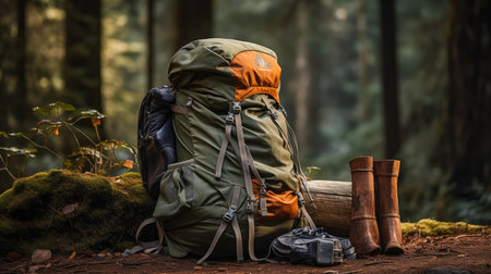 hiking and camping equipment, including a backpack, water bottle, and sturdy shoes, against the backdrop of a lush forest. ample space for informative copy