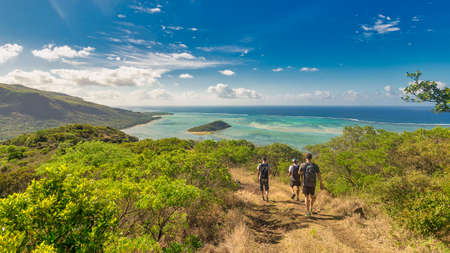 Scenic view from the mountain - a beautiful valley, clouds and ocean. Three hiker walking down the main symbol of Mauritius, the Le Morne Brabant mountain.