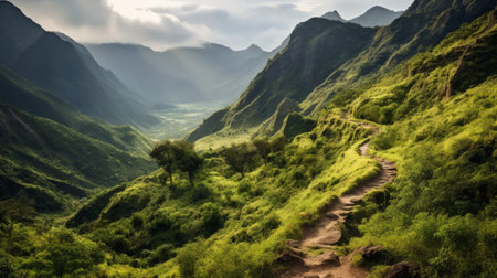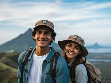 Adventurous travelers hiking through lush green mountains, the exploration and thrill of a summer vacation. Generative AI