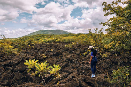 A young female wearing a hat walking on volcanic rock at masaya volcano national park