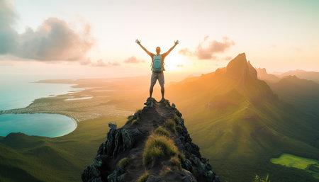 Man with arms up celebrating on top of the mountains, Hiker enjoying freedom on a hill at sunset, Freedom, sport, success and mental health.