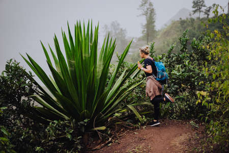 Female traveler amire huge endemic agave plant on Santo Antao Cape Verde