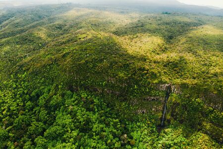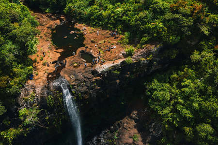 Aerial view from above of the Tamarin waterfall seven cascades in the tropical jungles of the island of Mauritius.