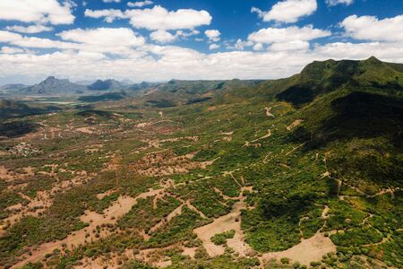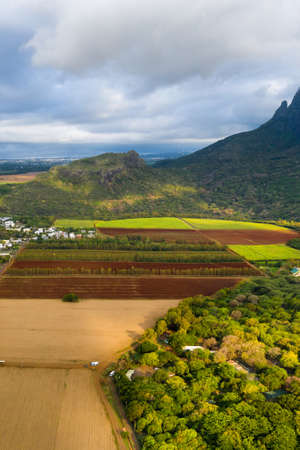 Bird's eye view of beautiful fields Islands of Mauritius and mountains.