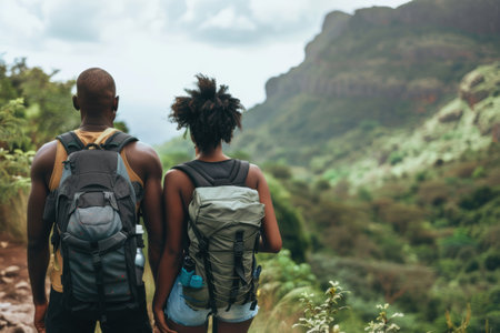 Black travelers hiking in lush green national parks with dramatic landscapes.