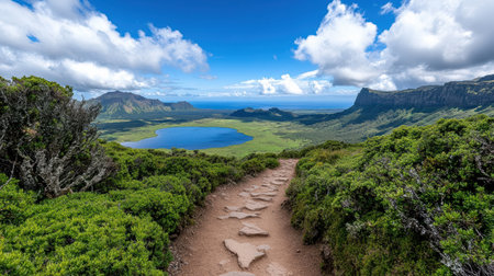 A breathtaking view of caldera from hiking trail, showcasing lush greenery and serene lake