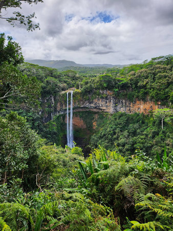 the waterfall of Chamarel Mauritius. water falling from the mountain.