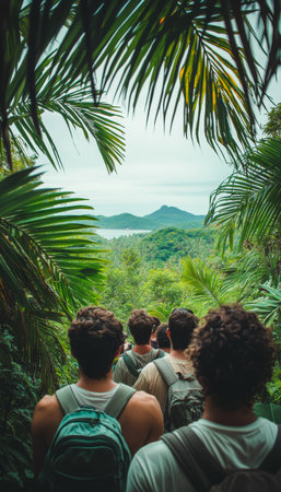 Group of Friends Trekking Through Lush Jungle, Embracing Adventure and Scenic Mountain Views