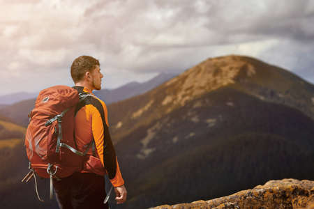 A young man hiker stands with a backpack in the mountains among beautiful landscape. Tourism, equipment, hiking. Summer vacation.