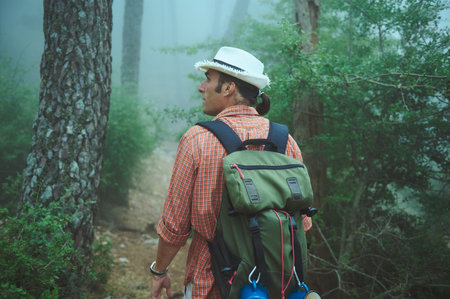 A man in a hat and backpack walks through a foggy forest. The misty atmosphere adds to the sense of adventure and solitude in nature.