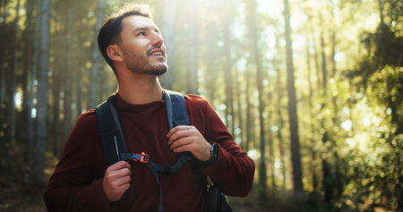 Happy man, hiking and forest with backpack in nature for outdoor adventure in wilderness. Male person, hiker or smile with bag, sunshine or trees for trekking journey, exploration or sightseeing