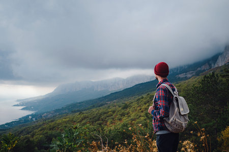 A tourist traveler with a backpack and a red hat is standing in the mountains and looking at the thick fog ahead. The concept of freedom and unity with nature