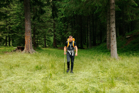 A focused male hiker, equipped with trekking poles and a sturdy backpack, strides confidently along a tranquil forest path. Surrounded by lush greenery and towering trees, the scene captures the essence of adventure and the beauty of nature, inviting viewers to embrace the great outdoors.