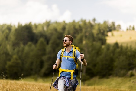 Young man is traveling, hiking in the mountains.