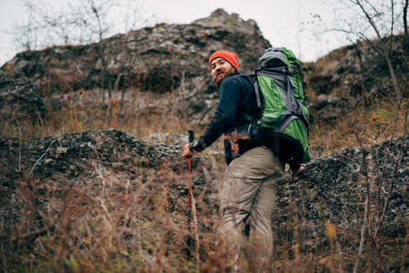 Outdoor shot of handsome Caucasian hiker young man hiking in mountains with travel backpack. Traveler bearded male have a break after trekking during vacation. Travel, people and lifestyle concept