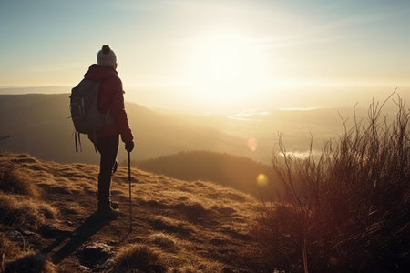 Successful woman backpacker hiking on sunset alpine mountain peak