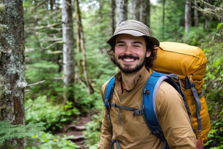 A young man with a green backpack stands on a forest trail, smiling warmly. Surrounded by tall trees and vibrant greenery, he enjoys an adventurous day outdoors.