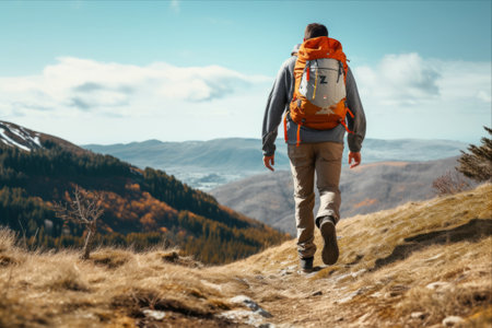 Rear view of hiker man hiking in mountains with travel backpack. Traveler man trekking during his journey. Travel, people, healthy lifestyle concept