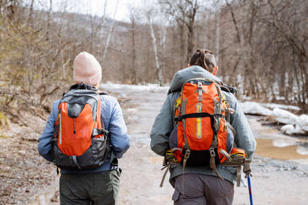 A guy and a girl go hiking on the road, a backpack on his back, hiking equipment for mountaineering, weekends in nature, active life, trekking in the mountains. high quality photo