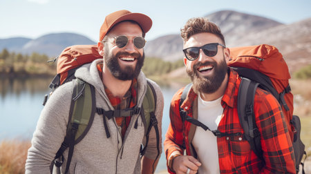 Happy gay male couple standing by beautiful mountain lake, concept of equality and love, banner