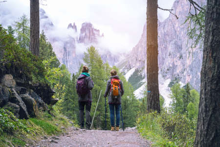 girls hiker walking along the trail at the mountains Dolomites, Italy