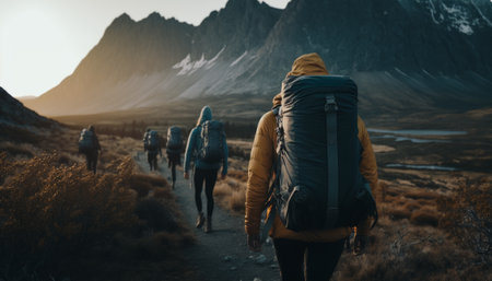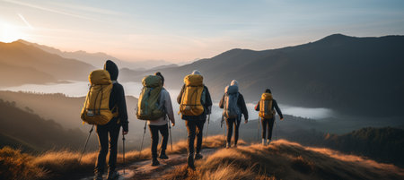 Group of hikers with backpacks hiking in the mountains at sunrise.