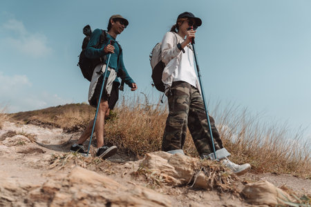 Young couple of hikers walking in the nature with trekking poles and wearing backpacks with a camping gear